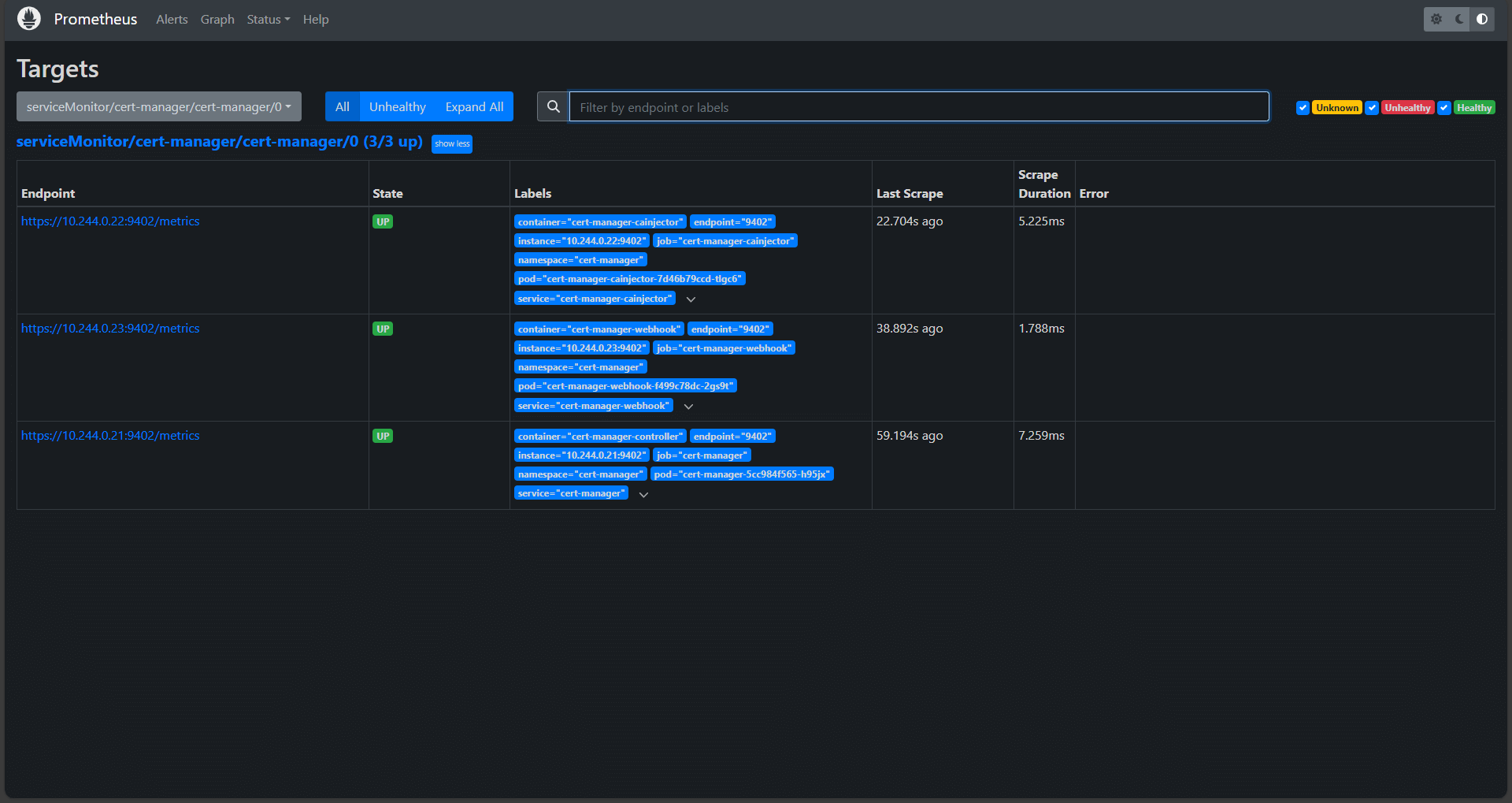 Check the health of the cert-manager scrape targets on the Prometheus status page: